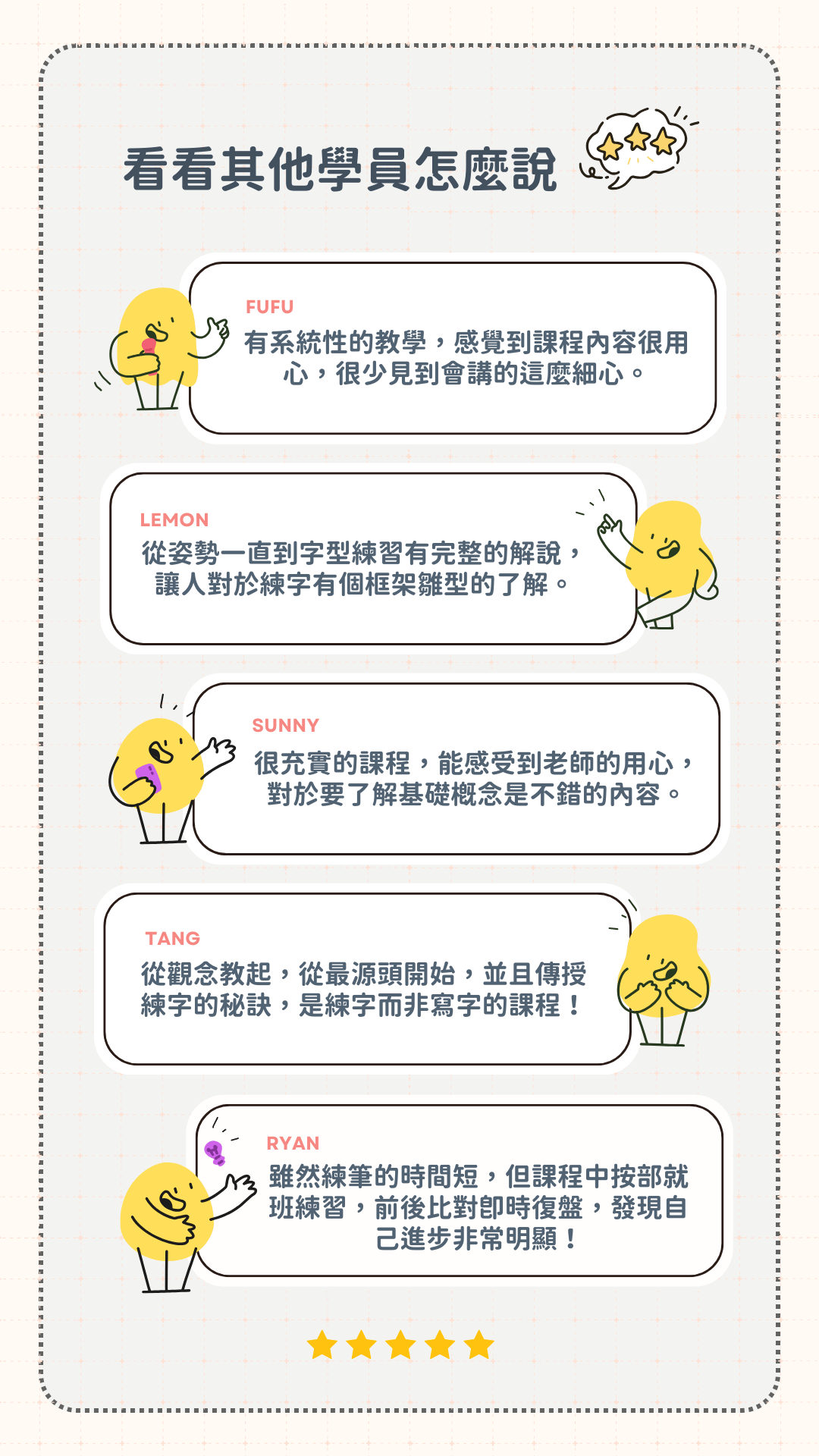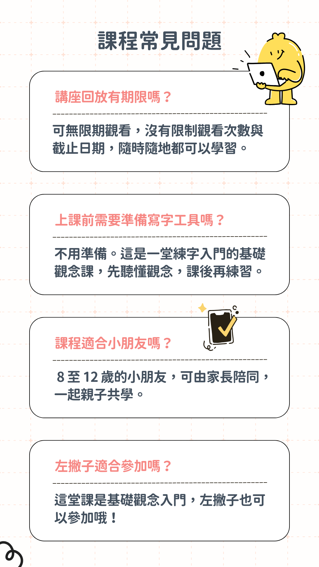 練字課後社群:課後加入專屬 Line 社群,提供學員互相交流與討論的空間