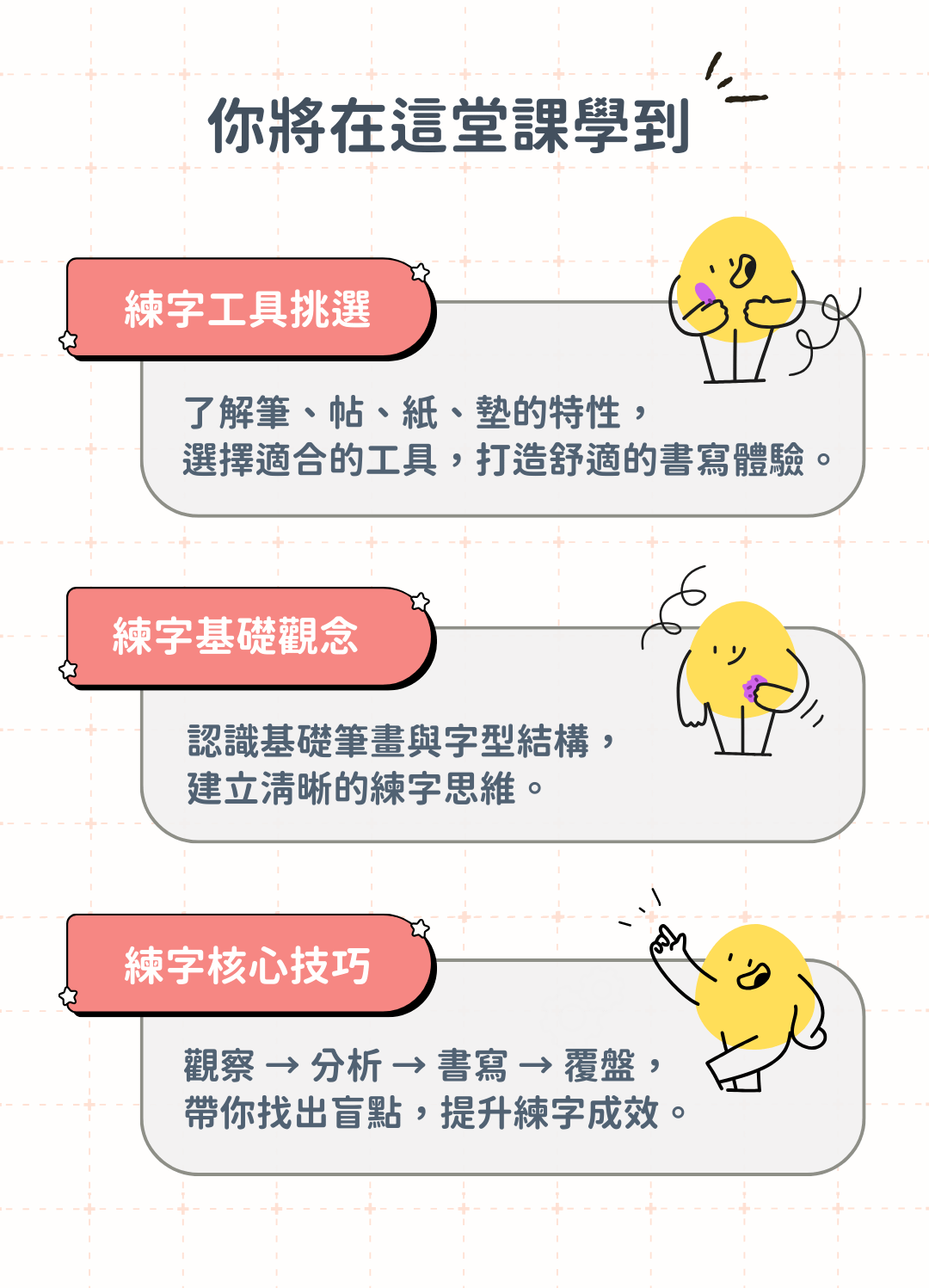 - 基礎觀念:拆解基礎筆畫與字型結構,掌握起筆與收筆位置