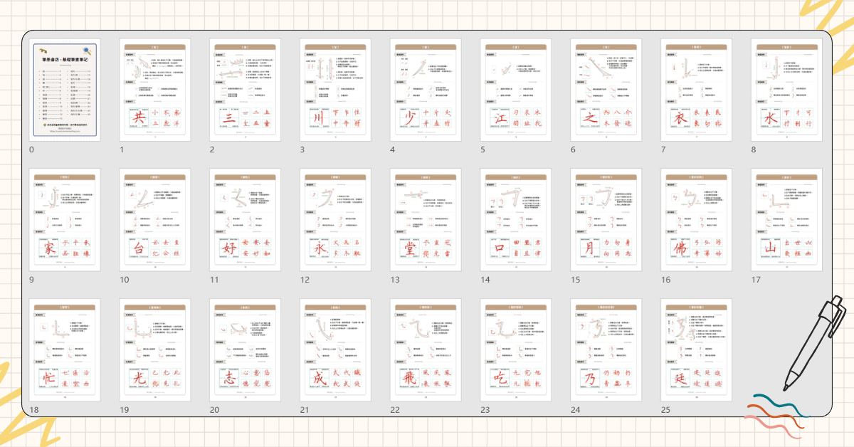 很多筆友會說,練字卡關時翻一翻這份筆記,就比較容易看懂每一筆該怎麼寫。如果你也想更有系統地理解硬筆字筆畫,可以參考這份筆記唷~