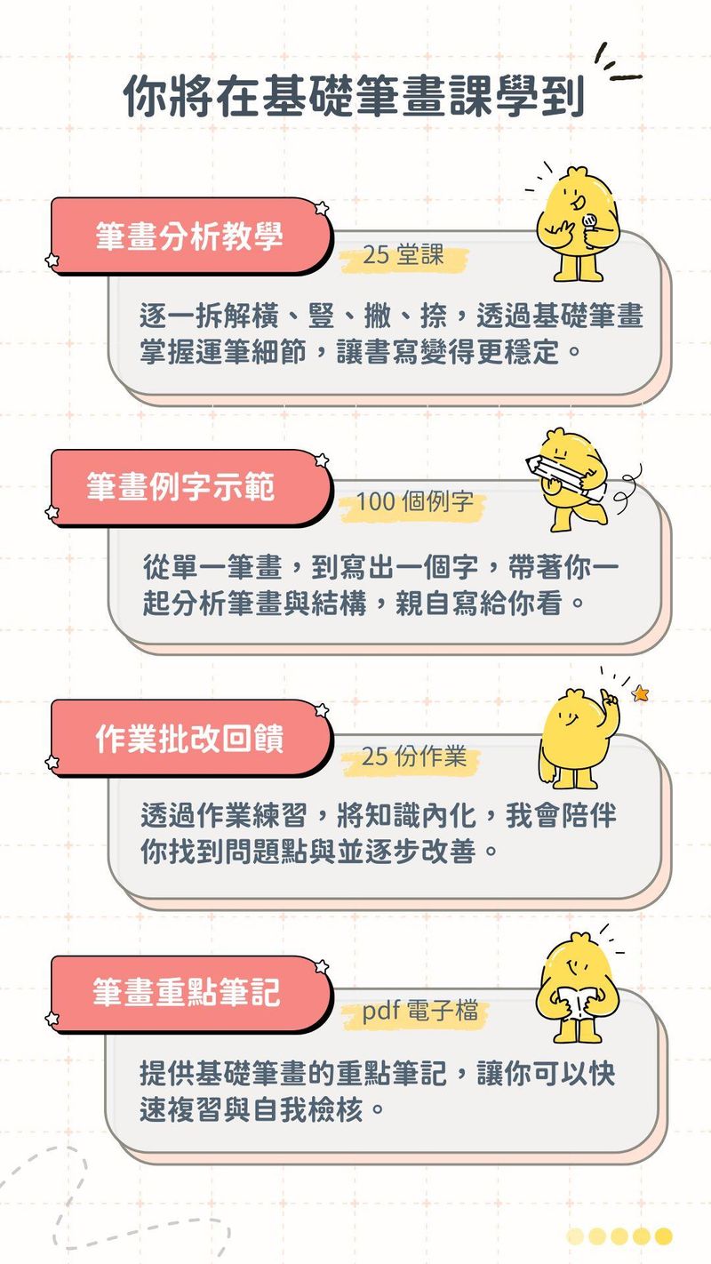 🟡 一次擁有兩門課:握筆姿勢 + 練字觀念 + 筆畫拆解 + 例字示範 + 作業批改,全方位學習。